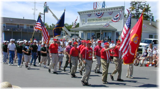 Over 50 floats and groups of marchers gathered at the top of Daddy Frank's hill to start the new route the new curbs prevented the use of part of Main Street. Everyone wanted to get in on this event, from the police and fire department and EMS to the local businesses to groups of tap-dancers, horseback and mini-bike riders, platforms of people celebrating by singing Born in the USA or, in the case of Joddy's talented family and friends, the more laid-back mellow refrains for which he is known. Marching veterans stopped on the return trip for a ceremony in which the names of the missing were read, followed by a moment of silence.