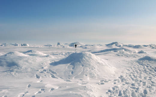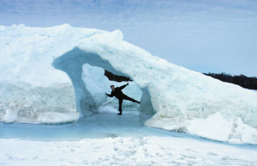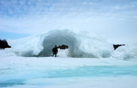 In early March, whispers began to abound about an unusual feature on the ice south of Cable's Bay: from the air, it looked like someone had broken hundreds of huge blue mirrors. People driving by began to stop and trudge out onto the fractured glacial sheet. At a thousand feet from shore the phenomenon was seen to be the result of a crack-and-surge cycle that had broken chunks of thick, clear ice and stacked them upon themselves at every conceivable angle. The individual pieces were too big, too askew, and too numerous to navigate, but on a sunny day they transformed the landscape into a glimmering, magic kaleidoscope.