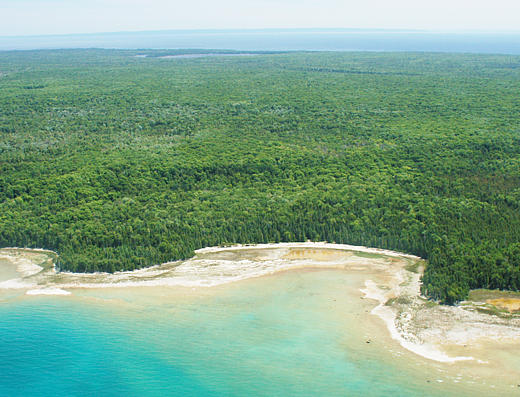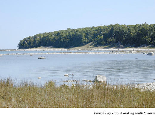 beaches, a small foredune of beach grass, and a mixed treeline.